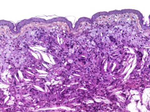 Histopathological findings: There is diffuse infiltration of the dermis by foamy macrophages and multinucleated giant cells, admixed with numerous cholesterol clefts.