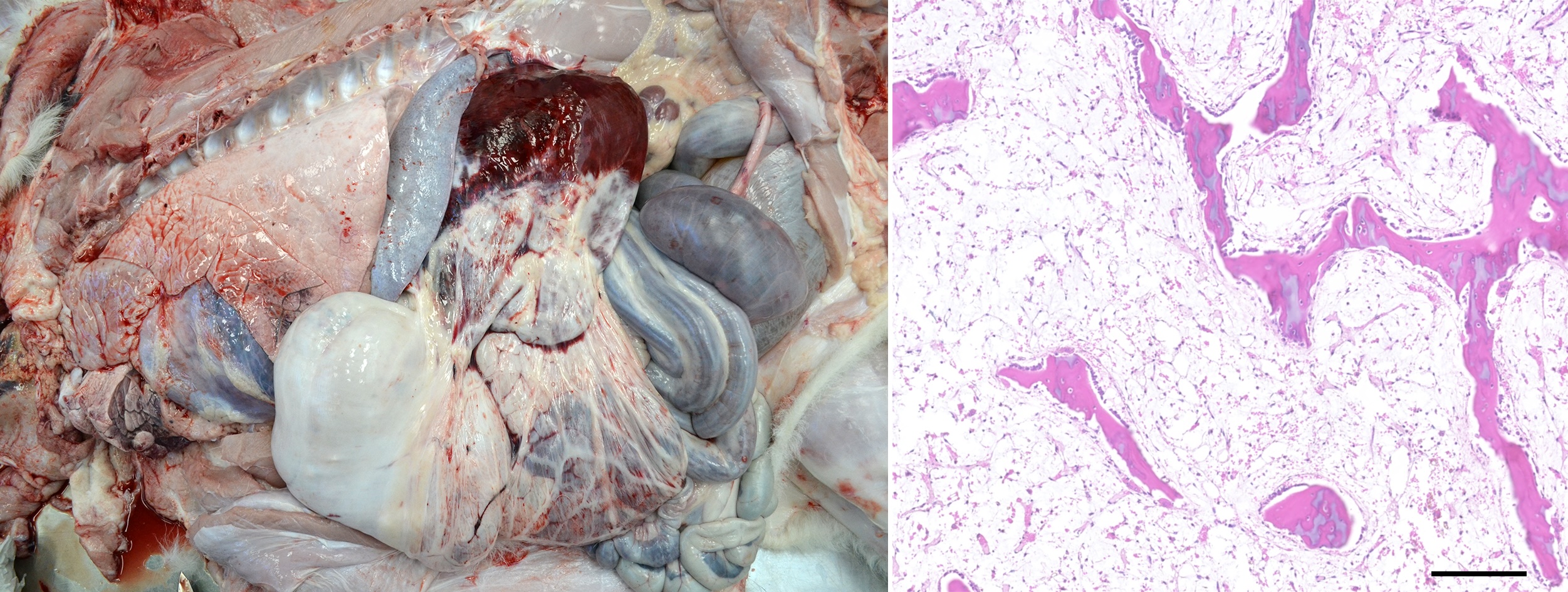 Comment: Based on macroscopic examination, a primary haemostatic disorder was suspected, and the histological examination of the bone marrow is diagnostic for a pancytopenia. A well described cause of pancytopenia in cattle in Europe is the Bovine Neonatal Pancytopenia (BNP), which has been linked to vaccination to the dams with a certain BVD vaccine (Pregsure® BVD). In this case the dam of this calf has never been vaccinated against BVD and there was no laboratorial evidence of natural BVDV infection in this calf, making the diagnosis of BNP unlikely. Therefore, the terminology ‘Bovine Idiopathic Pancytopenia’ instead is considered more appropriate by the contributors in this case. Interestingly, Chantillon et al. work describes an alloimmune mediated pancytopenia in 3 Belgian Blue suckler calves whose dams were not vaccinated against BVD either but were against other pathogens (bovine herpesvirus 1, parainfuenza-3 virus, bovine respiratory syncytial virus and bluetongue virus serotype 8). The initial antigenic trigger remains unknown, and a genetic component might be involved in the pathogenesis. In both cases, toxic causes were excluded on clinical grounds.