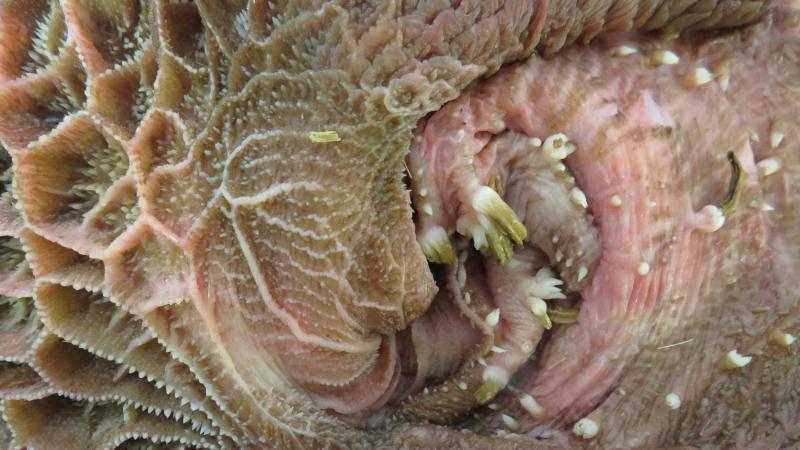 Findings: Several keratinized light brown, hard and curved structures were noted alongside the reticulo-omasal groove with partial obstruction of normal passage of feed. Comments: These unguiculiform papillae (papilla unguiculiformes) are variably-sized firm and claw-like keratinized papillae that usually are located along the borders of the reticulo-omasal groove. The papillae can cause a structural obstruction towards the omasum as they may prevent relatively large food particles to pass. In young milk-fed calves, they tend to have a white aspect and get darker over time.